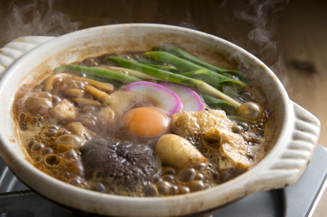 岡崎伝統の赤だし味噌「八丁味噌」で当社特製味噌生めんをじっくり煮込んだ、味わい深い料理です。使用している八丁味噌は、良質な大豆と食塩のみを使用して、天然醸造で二夏二冬以上の間熟成させており、大豆の旨味を凝縮した濃厚なコクが特徴です。手打ちめんの「コシ」「ツヤ」「食感」にきっとご満足いただけることと存じます。めんが長いのも特徴です。